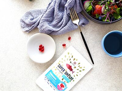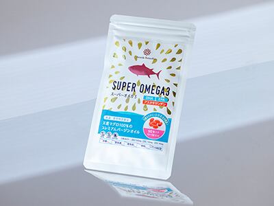 スーパーオメガ3は、天然マグロ100%から低温・真空特許製法で抽出された、フレッシュで酸化しにくいオメガ3オイルです。